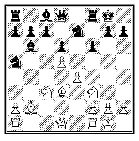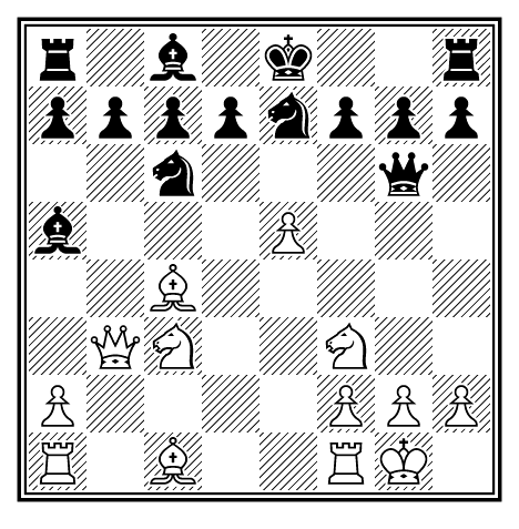 Эту позицию анализировали несколько десятков лет, и было найдено много вариантов, которые, повидимому оставляют черных при сравнительно безопасном положении короля, с лишней пешкой. Напр. 11. . . . b5; 12. К : b5, Лb8; 13. Фa4, Сb6; 14. Лad1, 0—0. Ни одно из этих продолжений, должно быть, не лучше следующего: