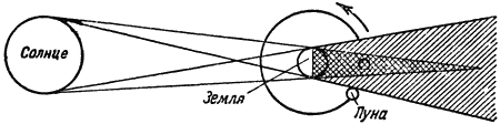 Как можно увидеть тень Земли? Оказывается, это возможно в тех случаях, когда тень Земли падает на Луну. Бывает это во время полнолуния, когда Земля находится между Солнцем и Луной. Освещаемая Солнцем, она отбрасывает в пространство тень, которая и может упасть на Луну. Тогда мы наблюдаем полное или частное лунное затмение (рис. 1).