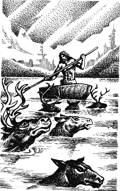 Альф Быстроногий решительно ударил веслом, протянул копье и ткнул навесно в бок ближайшего оленя. Олень мотнул головой, отпрыгнул в сторону и стал биться, захлебываясь. Через минуту он опрокинулся боком и поплыл вниз по течению, как кожаный мешок с мясом, унесенный с берега приливом.