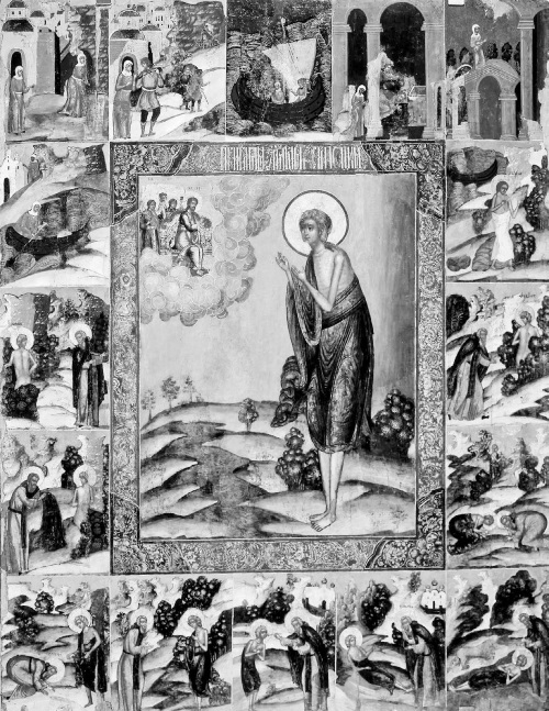 После двадцати дней пути он однажды приостановился и, обратившись на восток, стал петь шестой час [3] , исполняя обычные молитвы: во время своего подвига он, приостанавливаясь, пел каждый час и молился. Когда он так пел, то увидал с правой стороны как будто тень человеческого тела. Испугавшись и думая, что это бесовское наваждение, он стал креститься. Когда страх прошел и молитва была окончена, он обернулся к югу и увидел человека нагого, опаленного дочерна солнцем, с белыми, как шерсть, волосами, спускавшимися только до шеи. Зосима побежал в ту сторону с большою радостью: в последние дни он не видал не только человека, но и животного.