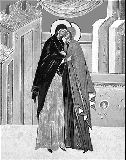 Предание говорит, что Дева Мария на пути в Иутту заходила в Иерусалим воздать поклонение Господу в Его святом храме и представить священникам храма заказанное ей рукоделие. Первосвященник, благословляя Деву за трудолюбие, вдохновенно сказал Ей: «Мариам, Господь Бог возвеличит имя Твое, и ты будешь благословенной во всех родах земных». Присутствующие при этом в храме, за исключением Самой Богоматери, понимавшей истинный смысл этих слов, приняли их за простую похвалу. Из Иерусалима Пречистая Дева пришла в Иутту, вошла в дом Захарии и словами «мир тебе» приветствовала свою любимую родственницу Елисавету. Господь явил в этом свидании двух святых жен новые чудесные знамения. Приветственное слово Марии слышит Елисавета, но таинственную, чудесную силу его первым ощущает незримый в утробе Иоанн и через него уже и матерь его, Елисавета.