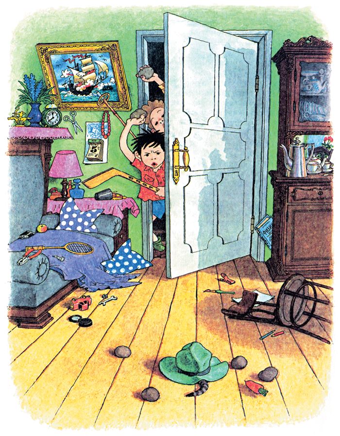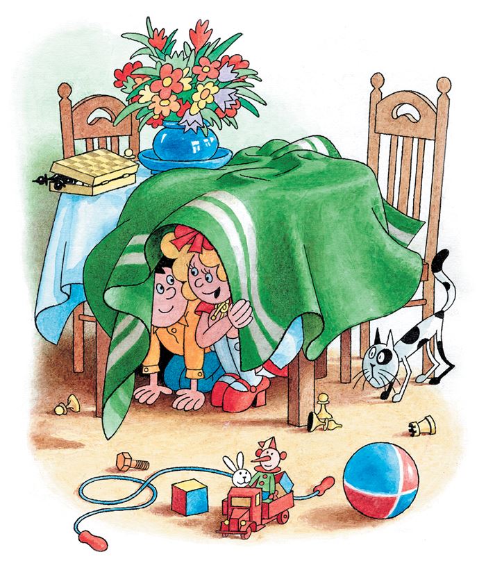 Я подкрался на цыпочках к столу, дёрнул за край одеяла и бегом к двери. Одеяло упало, а под столом никого нет. Мы обрадовались. Хотели починить домик, только Валя говорит: