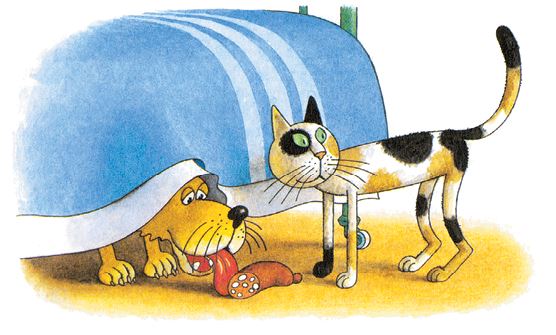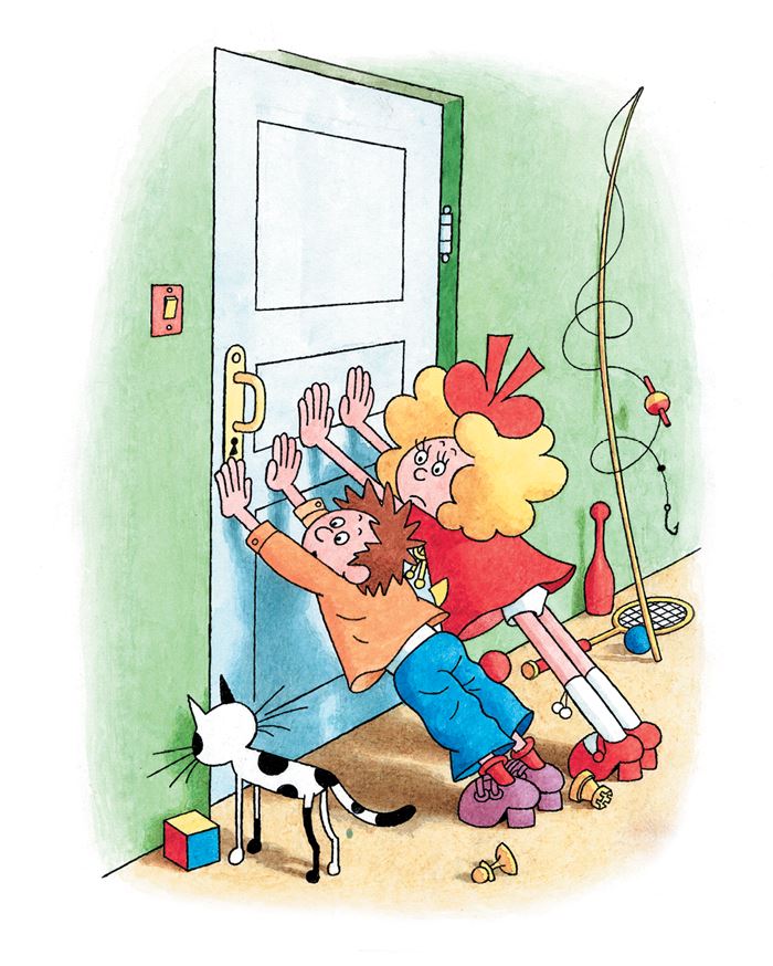 Открыли мы дверь. В комнате никого нет. А к столу подойти всё-таки боимся: вдруг из-под него серый волк вылезет!
