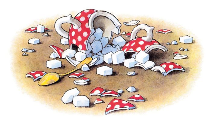 Мама открыла буфет, взяла сахарницу… Ах!.. Сахарница развалилась, сахар посыпался на пол.