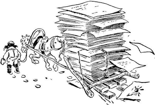 Однажды, в студеную зимнюю поруЯ утром покинул подшефный колхоз.Гляжу, поднимается медленно в горуЛошадка, б у м а г и везущая воз.И, занятый важным, ответственным делом,Лошадку ведет под уздцы паренек.И лошадь вспотела, вся в инее белом,И парень, как видно, порядочно взмок…— Здорово, дружище! — А мы не знакомы…— Уж больно ты грозен, как я погляжу!Откуда бумажки? — Из райисполкома.Там пишут и пишут, а я развожу.Машинки стучат посильней дровосека…— А что, в исполкоме большая «семья»?— Работников много! Да два человекаБывают в колхозах: шофер наш да я.Мы с ним заявляли об этом открыто,Собранье решало: «Послать!..» «Обязать!..»Все в дело подшито. И все позабыто!Придется, как видно, в газету писать.Меня возмутила такая картина,Я понял: бумажная здесь целина!Что слишком живуча старушка-рутина,С которой сатира сражаться должна.…И в ту же студеную зимнюю пору,По гладкой дороге гоня лошадей,Поехал взглянуть я на эту контору,На этих бездушных и черствых людей.…Сидят бюрократы, в бумагу зарылись.Во всех кабинетах царит полумрак —От жизни кипучей они оградилисьКитайской стеной директив и бумаг!Здесь, видно, привыкли к парадным докладамДа к сводкам трескучим в распухших делах,Здесь блеск почитается выше награды, —Но блеск тот, увы!.. на протертых штанах!И мы в осужденье суровом и резкомОбязаны сделать решительный шаг:Давайте, товарищи, вышибем с трескомБездушных и черствых б у м а г о м а р а к!