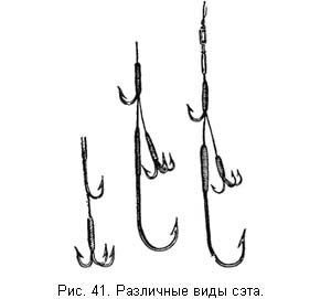Более действительные сэты состоят из одиночного верхнего или губного крючка и известного числа якорьков и одиночных крючков. Для передвижения губного крючка с двумя петлями достаточно ослабить обороты жилки, обвитой вокруг завязки в два или три оборота; когда он будет поставлен на надлежащее место, обороты опять затягиваются. Губной крючок с одним колечком передвигается еще проще, но употребляется довольно редко. Как якорьки, так и одиночные крючки сэта должны быть полированы (т.е. не синеные и не крашеные). Иногда даже их серебрят гальваническим путем, шелк, которым они привязаны к жилке, должен быть белый или красный, причем очень полезно обертывать эти завязки узенькой полоской серебряной мишуры.