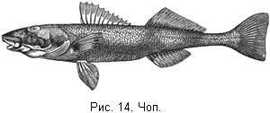Эта рыба имеет у нас весьма ограниченное распространение и потому почти вовсе неизвестна. Как кажется, она встречается только в Днестре. Чоп легко отличается от всех других окуневых своим удлиненным веретенообразным телом и выдающимся рылом. Спина и бока у него серовато-желтого цвета, брюхо беловатое, с боков тела находятся 4 косые темно-бурые полосы. Величина его незначительна, и у нас он, кажется, никогда не достигает фута длины. В Дунае же, по свидетельству Блоха и Нордмана, попадаются особи длиной от 14-16 дюймов и весом от 2-х до 3-х фунтов.