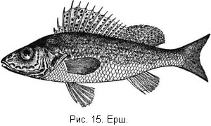 к названию этой рыбы ершом, составляет единственное средство ее защиты: перед этим лесом твердых шипов отступает и голодная щука.Складом своим ерш напоминает окуня, но передний - колючий - спинной плавник его неразрывно связан с задним, толстые колючки (2) заключаются и в заднепроходном плавнике; жаберные крышки (щеки) также усажены 11-12 острыми шипами. Глаза у него очень большие - на выкате, с мутно-лиловой, иногда даже синеватой радужиной. Спина серо-зеленая с черноватыми пятнышками и точками, бока несколько желтоватые, брюхо беловатое, впрочем, цвет его зависит от местопребывания: в реках и озерах с песчаным дном ерш всегда светлее, чем в иловатых местностях. Здесь он иногда бывает почти темно-зеленого цвета. В прудах ерш большей частью имеет желтоватое, даже желтовато-серое брюшко. Кроме того, в реках ходовой ерш, как и всякая другая рыба, всегда белее оседлого «стоялого», или «стоевого», ерша.