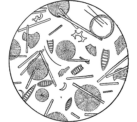 Другой группой грунтов являются отложения океанические. В этих отложениях большую роль играют мелкие скелетики одноклеточных животных — глобигерин и радиолярий, или одноклеточных растений — диатомей, обитающих в обширных просторах открытого океана. При громадной глубине океанов трупы мелких организмов, медленно падающие на дно, по пути большей частью растворяются или съедаются глубоководными обитателями. Лишь немногие войдут в состав донных отложений. Несмотря на это, в некоторых районах количество микроскопических организмов так велико, что илы на дне моря с полным основанием называют «глобигериновыми», «радиоляревыми» или «диатомовыми», в зависимости от организмов, скелеты которых преобладают в иле. Если мы рассмотрим под микроскопом несколько маленьких комочков глобигеринового ила, взятого со дна океана, то увидим, что в одном кубическом сантиметре этого ила окажется около 500 тысяч раковин и обломков глобигерин, 150 тысяч иголочек губок, 100 тысяч скелетиков радиолярий и створок диатомей и около 12 миллионов иголочек и пылинок! Кроме того, среди океанических отложений находят пыль, принесенную с суши, и продукты вулканического происхождения.