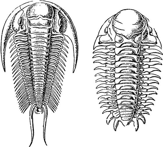 Нам известно более 2 тысяч видов трилобитов. Очевидно, их было значительно больше. Рассматривая сейчас в музее окаменелые остатки этих ракоподобных существ, мы мысленно переносимся к морям, существовавшим сотни миллионов лет тому назад. Вот перед нами трилобиты с глазами, сидящими на длинных стебельках. Они, очевидно, жили, слегка закопавшись в ил и высматривая проплывающую добычу.
