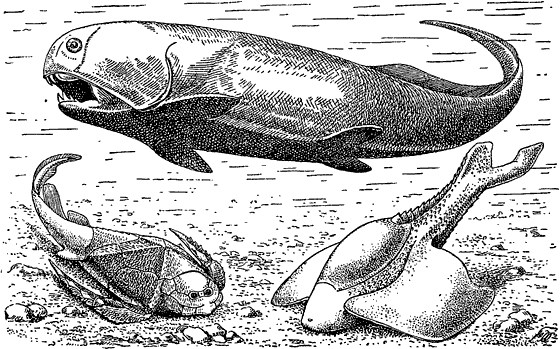 Панцырные рыбы: сверху — динихтис, слева — ботриолепис, справа — бесчелюстная рыба псаммолепис.