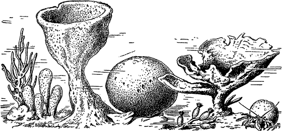 Не нужно думать, что вся известковая масса кораллового рифа или острова состоит только из одних скелетов кораллов. Одноклеточные фораминиферы, черви, мшанки, моллюски, иглокожие и другие животные, обладающие известковым скелетом, поселяются между колониями кораллов и вместе с ними образуют огромную массу. Отдельные колонии и остатки различных организмов скрепляют воедино известковые водоросли, в особенности литотамнии. Разрастаясь, водоросли покрывают известковой коркой колонии, цементируют их. Очень большую работу по созданию коралловых сооружений проделывают мшанки, эти мельчайшие червеобразные животные. Иногда отложившиеся известковые массы мшанок конкурируют по объему с сооружениями самих кораллов.