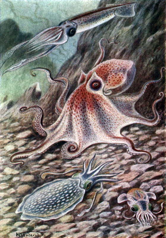 Головоногие моллюски: сверху — кальмар, осьминог, сепии.