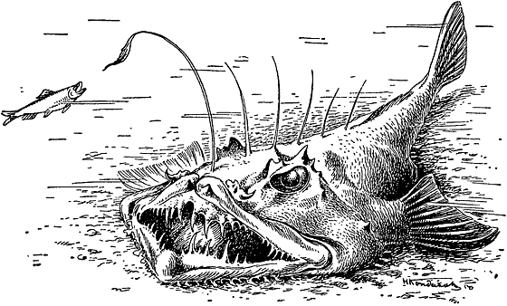 Многие хищные рыбы, охотясь за пищей, прибегают к хитрости. Неподвижно лежит на дне рыба, носящая необыкновенное название «морской чорт». Над головой у него шевелится червеобразный кончик отдельно стоящего луча спинного плавника. Набросится какая-либо доверчивая рыбка на мнимого червяка и окажется в огромной пасти морского чорта. Вот так и живет этот хищник: и плавать не надо, и пища сама в рот идет!