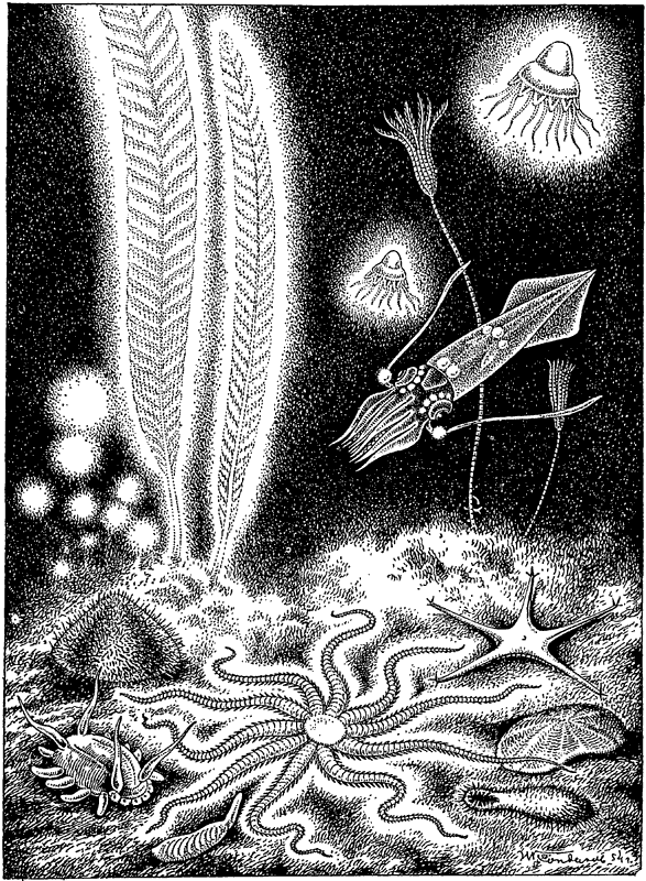 Действительность оказалась значительно проще. В морях и океанах существует замечательное явление — суточная вертикальная миграция различных рачков, червей, рыб и многих других животных. Обитатели поверхностных слоев днем находятся на глубине, а ночью собираются в поверхностные слои. Эти суточные миграции охватывают большие слои океана. Миллиарды мелких рачков подымаются от глубин в 500 метров к поверхности океанов, где они питаются одноклеточными водорослями. Когда они опускаются, им навстречу с глубин в 1000–1500 метров подымаются планктоноядные рыбы и кальмары. В свою очередь, при опускании вниз они окажутся пищей хищников, подымающихся из пучин океана. Таким образом, в океане существует «пищевая лестница», по которой богатства поверхностных слоев переносятся вниз и кормят всю многокилометровую толщу вод океана.