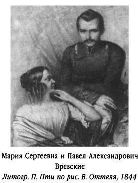 В селе Александрове был портрет-гравюра (литография П. Пти по рис. В. Оттеля, 1844 г. — Авт.): Павел Вревский с женой. Оба молодые, красивые, симпатичные. Она сидит в кресле, слегка повернув головку к П. А., который стоя склонился над ней. Какой нежностью, какой грацией пленительной полна она! Каким счастьем веет от лица Павла Александровича! Какой аристократизм лица и фигуры! Но вместе с тем какой-то нежной грустью веяло от этой пары… как бы предчувствие скорой разлуки.
