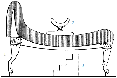 Кровать (1) с подставкой для головы (2); маленькая лестница (3) внизу служит для того, чтобы подниматься на кровать. Гробница Рамсеса II (согласно W., I, 416)