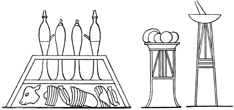 Их часто делали из цветных камней [54] . На каждую из них ставили один кувшин или кубок, или же, например, корзину с плоским дном, которая потом использовалась как поднос для обеденных блюд; использовали также низкую рамку из тонких дощечек, главным образом в качестве подставки для кувшинов. В более поздние времена эти подставки из дощечек были единственной разновидностью стола, и в домах Эль-Амарны мы видим такие столы всех размеров и в обеденном зале хозяина, и в спальнях, и в кухнях. Лишь изредка мы обнаруживаем подставки для кувшинов и корзины старого образца, причем, как правило, для жертвоприношений [55] .