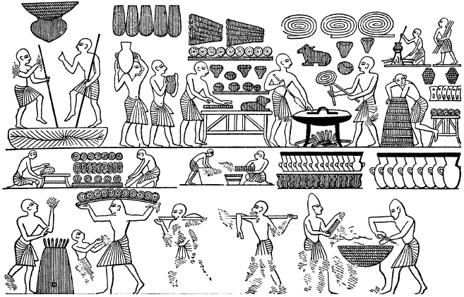 Царская пекарня. Из гробницы Рамсеса III (согласно W., ii. 34, где изображено — внизу слева , – что по ошибке только одна из булок прилеплена к печи)