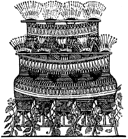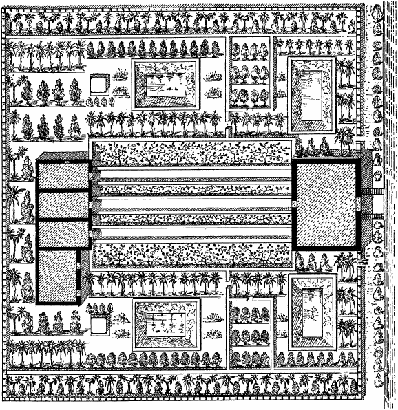 Высокая зубчатая стена окружает этот почти квадратный участок земли; вход есть только спереди: там широкая лестница в один пролет спускается от просторной сторожки, где находился привратник, к двум маленьким дверям, выходившим на канал. Через главный вход, украшенный именем правящего царя, мы проходим сквозь маленькую дверь сразу в виноградник, который показан в центре плана. Пышные разросшиеся лозы с большими гроздями пурпурного винограда обвиваются вокруг решеток, сложенных из камня, и через проходы между рядами лоз дорожка ведет сразу в дом.
