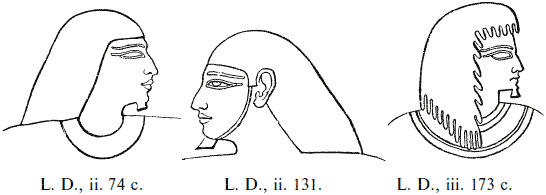 В эпоху Среднего царства искусственная борода была распространена шире; ее носили даже чиновники номов и поместий [134] , хотя в более ранние времена их предшественники очень редко делали это. Во времена Нового царства ее опять надевали редко, к примеру, никто из придворных Эхнатона этого не делал, поскольку такая борода считалась старомодной и носить ее было положено лишь во время некоторых обрядов [135] . Более длинная разновидность искусственной бороды надевалась исключительно с царским нарядом; хотя в эпоху Среднего царства мы иногда видим ее на правителях номов, это было таким же нарушением царской привилегии, как ношение шендота. И наконец, считалось, что боги носят бороду особой формы: их бороды были на четыре ширины пальца длиннее тех, которые носили люди; кроме того, такие бороды были заплетены как косы и изогнуты на конце [136] .