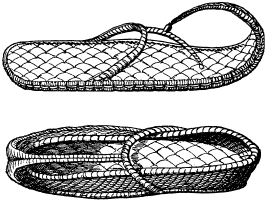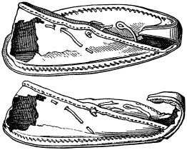 Один ремешок охватывал подъем ноги, другой проходил между пальцами [139] . Иногда, чтобы сандалия прочнее держалась на ноге, сзади добавляли еще третий ремешок, огибавший пятку, иногда носок сандалии загибали кверху для защиты пальцев. Сандалии с боками, вероятно, относятся к более позднему времени; это уже почти башмаки.