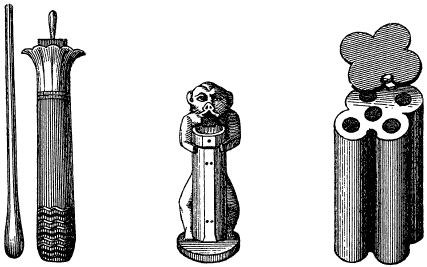 Флакончики из-под краски для глаз: в форме колонны, рядом с ним палочка, с помощью которой наносили краску; флакончик держит обезьяна; крышка и кисточка утрачены (замок Алнвик); для четырех разных видов (согласно W., ii. 348)