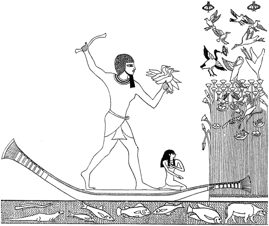 Когда какой-либо народ поднимается на более высокие уровни цивилизации, каждый раз многие занятия, которые в прошедшие времена были необходимы для поддержания жизни людей, перестают быть необходимыми, но при этом не оказываются забытыми. Хотя их практикуют реже, людям кажется, что они приносят более чистое удовольствие, чем прежде, и, при отсутствии принуждения, то, что в прежние времена было тяжелой работой, становится дарящей наслаждение забавой. Когда мы впервые получаем возможность взглянуть на египтян, вероятно, уже прошли века с тех пор, как те потеряли необходимость в том, чтобы пронзать рыб острогой или убивать птиц бумерангом для добывания пищи. Однако в более поздние времена эти два занятия доставляли им гораздо больше удовольствия, чем