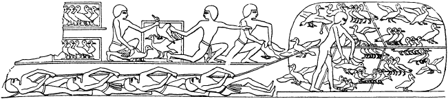 Как завлекали птиц в сеть – с помощью приманки или с помощью подсадной птицы, мне трудно сказать, потому что в гробницах всегда любили изображать тот момент, когда сеть затягивают. Три или четыре парня, сбросившие с себя всю, до последнего клочка, бесполезную одежду, держат длинный канат и затаив дыхание ждут команды стягивать края сети. Их хозяин в это время подобрался через кустарник близко к сети, увидел и услышал, что птицы попались в нее. Он боится распугать птиц и потому не смеет подать своим людям сигнал криком, а машет им белым лоскутом льняной ткани, подняв его над головой. Тогда работники изо всех сил тянут за канат – тянут, пока не окажутся в прямом смысле слова лежащими на земле. Их старания вознаграждены, так как сеть полна: в нее попали от тридцати до сорока больших водоплавающих птиц – как мы видим, большая часть добычи – гуси, но в сеть случайно попал и несчастный пеликан.