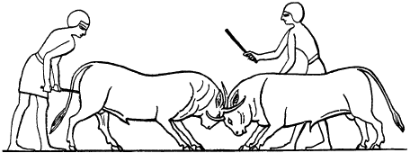 Поэтому вполне естественно, что египтяне получали огромное удовольствие от боев между быками и держали для этой цели специальных быков. На арене боевые быки имели собственные имена; из тех, которые изображены ниже, одного зовут «любимец», а имя другого может означать «широко ударяющий». Пастухи с короткими палками присутствовали
