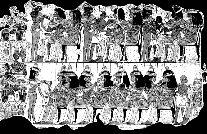 Во время исполнения музыки и танцев на пирах гости явно не сосредоточивались на этих представлениях так полно, как этого требует этикет на наших музыкальных вечерах. Напротив, они пили, разговаривали и занимались своим туалетом. Как я уже отметил раньше, согласно представлениям египтян о приеме гостей, слуги должны были умастить гостей благовониями и украсить венками, гости должны были получить в подарок новые ожерелья, и к черным прядям их париков полагалось прикрепить цветы лотоса или его бутоны.