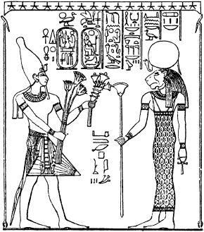 Богиня Сехмет. Перед ней стоит Рамсес II, который подносит ей в дар цветы