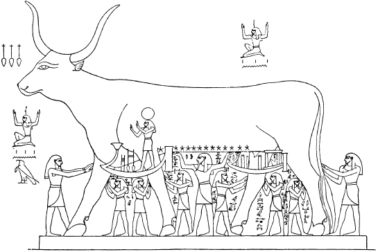 Изображение небесной коровы, которую несет бог Шу и поддерживают другие духи. По ее телу, которое украшено звездами, два раза проделывает свой путь небесная ладья. На этом рисунке-иллюстрации точно показано, как он дополняет ту священную книгу, о которой шла речь выше. Кроме того, по краям рисунка сделаны пояснительные надписи, причем даже с указанием того, надо их повернуть направо или налево (м шат)