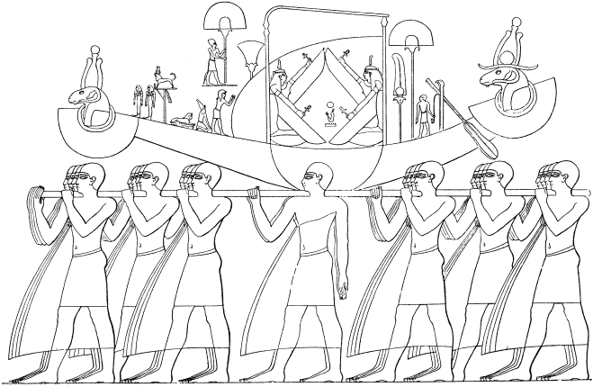 Священный корабль Амона-Ра во времена Тутмоса II в Карнаке. Когда этот храм позже был перестроен, Сети I велел изобразить на нем свое имя (согласно L. D., iii. 14)