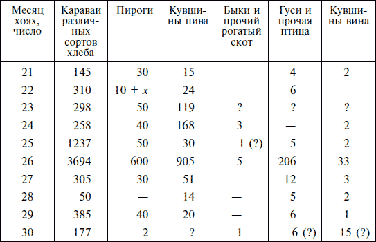У читателя невольно должен возникнуть вопрос: что происходило с этими излишками пищи после того, как она исполнила свое назначение, полежав на алтаре перед богом? Мы можем предположить, что ее относили в «дом продовольствия» и постепенно расходовали на прокорм служителей и жрецов храма. В таком случае разное количество жертвоприношений указывает лишь на большее или меньшее значение праздника. Однако, посмотрев внимательно на такие списки, как приведенный выше, мы начинаем понимать, что дело обстоит не так просто; если в разные дни праздника количество хлебов меняется от 50 до 3694, кувшинов пива от 15 до 905 и птиц от 4 до 206, то такие большие различия нельзя объяснить одной лишь разницей в святости отдельных дней. Конечно, 26 хояха, праздник Сокара, был главным днем всего празднества, но он не мог быть в двадцать раз святее, чем 30 хояха, день воздвижения столба Дед. Гораздо вероятнее, что причина для выбора именно этих цифр была ближе к практике жизни: возможно, еда должна была насыщать разное число людей, и эти люди были не изображениями бога, а жрецами и мирянами, участвовавшими в празднестве. Численность второй группы, вероятно, бывала очень разной в разные дни празднества, и в зависимости от того, был праздник закрытым или открытым, толпа тех, кто ел и пил жертвенные дары на пиру, была, соответственно, больше или меньше. Это объяснило бы и разницу качества пищи: в одном случае собирались люди из верхов общества, которым были нужны жареное мясо и пироги, в другом преобладали люди из низов, которым было достаточно подать караваи хлеба.