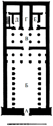 Храм Амона-Ра в Карнаке, построенный Рамсесом III (пример храма обычного типа). А – пилон. Б – двор. В – гипостильный зал. Г – часовня Амона. Д – часовня Мут. Е – часовня Хонсу. Вторая и третья часовни имели боковые комнаты, в одной из которых есть лестница, ведущая на крышу