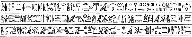 Эти знаки, конечно, уже нельзя было читать в истинном смысле этого слова, потому что никто не смог бы понять по этим штрихам и точкам, каким иероглифам они соответствовали вначале. Мы должны рассматривать группу знаков как единое целое, то есть запомнить, что перпендикулярный штрих и четыре точки означают «человечество», и т. д. Прошло еще несколько веков, и из этих сокращенных написаний возникла новая, независимая от других письменность – так называемое демотическое письмо. Если мы хорошо осмыслим тот факт, что полное вырождение алфавита происходило одновременно с описанным выше вырождением орфографии, мы сможем представить себе, какими причудливыми были многие поздние египетские шрифты.