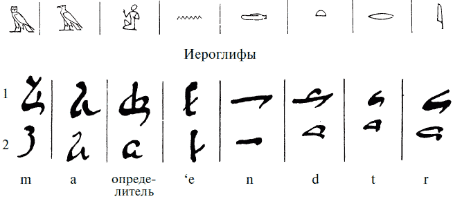 На предыдущих страницах я всегда пользовался словом иероглифы , но этот термин может обозначать не только тщательно выписанные знаки, которые обычно встречаются нам в надписях и которые мы печатаем, но и еще две другие разновидности письма. В эпоху Древнего царства уже был изобретен особый курсивный шрифт для повседневного использования – так называемое иератическое письмо, в котором различные иероглифы с течением времени все больше упрощались – для того чтобы их было легко писать камышовым пером, которым пользовались писцы.