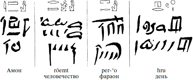Но высшей степени эта путаница достигла при XX династии: начиная со времени ее правления те писцы, кто вел деловые записи и должен был работать быстро, стали сокращать до нескольких штрихов те слова, которые встречались им особенно часто. Приведенных ниже примеров достаточно, чтобы стало видно, как сильно этот шрифт отличался даже от более раннего курсива.