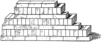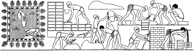 Приведенный выше [389] интересный рисунок времен XVIII династии позволяет нам увидеть, как египтяне изготавливали кирпичи. Кладовые великого храма Амона уже не могли вместить все царские дары, и потому Тутмос III приказал построить новое здание. Высокопоставленный чиновник, которому было поручено это дело, изобразил для нас в своей гробнице, как было изготовлено необходимое количество кирпичей. Делали их, как обычно в таких случаях, пленники-азиаты, которых подарил храму царь. Как мы видим, нильский ил сначала увлажняли – два человека черпают для этого воду из пруда. Затем ил рыхлят обычной египетской мотыгой. После этого его раскладывают в деревянные формы, которые, как видно по многим имеющимся у нас кирпичам, были помечены именем правящего царя. Готовые кирпичи раскладывали на солнце, чтобы они высохли; сухие кирпичи, которые на нашем рисунке можно узнать по малому размеру, укладывали в штабели так, чтобы строители могли забрать их. Дальше на нашем рисунке показан процесс строительства, и одну особенность, которую мы замечаем здесь, мы видим также у всех дошедших до нас кирпичных построек – а именно необычный порядок укладки кирпичей. Египтяне в древности, как и в наши дни, редко клали кирпичи так, как мы кладем их сейчас, – все во всех рядах широкой стороной вниз. У египтян было в обычае чередовать слои кладки – сначала один или два ряда кирпичей клали на широкую сторону, затем один или два – на узкую.