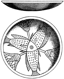 Маленькая фаянсовая чаша из Берлинского музея, украшенная рисунком, изображающим трех рыб с одной головой и три цветка лотоса (согласно W., ii. 42)