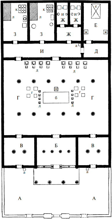 Очень сильно отличался от этого дома по планировке тот дом в Эль-Амарне (Ахетатоне), в котором жил упомянутый ранее «святой отец» Эйе со своей семьей [48] . Этот план тоже имеет форму прямоугольника, короткая сторона которого расположена параллельно улице; поэтому было невозможно расположить дворы и постройки обычным образом.