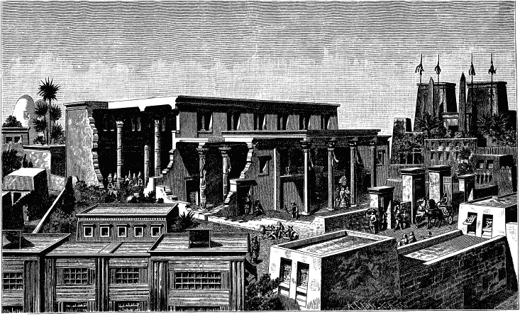 Недалеко от Мединет-Абу есть развалины – вероятно, остатки царского замка. Как я уже отметил, Рамсес II и Рамсес III заложили несколько дворцов возле храмов, которые они основали на западном берегу. То приятное, похожее на башню здание с узкими комнатами, которое так хорошо известно под названием «Павильон из Мединет-Абу», является частью благородного царского дворца, который Рамсес III построил для себя «по подобию зала Атума, который находится в небесах, с колоннами, балками и дверями из серебра и большим балконом из хорошего золота, чтобы появляться на нем». Нарушая обычай, Рамсес III построил фасад своего дворца из каменных блоков, и потому развалины этой части здания сохранились, в то время как от самого дворца ничего не осталось.