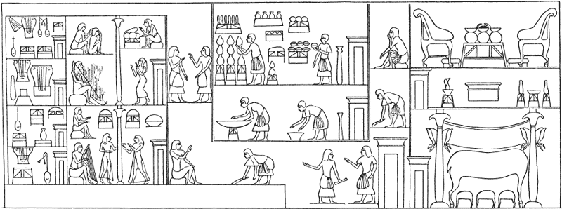 Слева находится пекарня, которая состоит из прихожей и еще двух комнат. Здесь рабочий толчет зерно в огромной ступе. Две большие комнаты, которые наполнены кувшинами, служат кухнями, и в каждой из них есть низкий очаг.