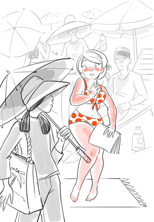 Но самое глубокое потрясение я испытала на пляже острова Чеджудо, когда увидела, что народ отдыхает на берегу мало того, что под зонтиками, но еще и в рубашках с длинными рукавами, удлиненных шортах, а многие – в брюках! И, что уж совсем невероятно, в этом обмундировании люди купаются в море! И зонтики, кстати, тоже зачастую берут с собой в воду. Как же они плавают? А корейцы почти совсем не плавают – лишь