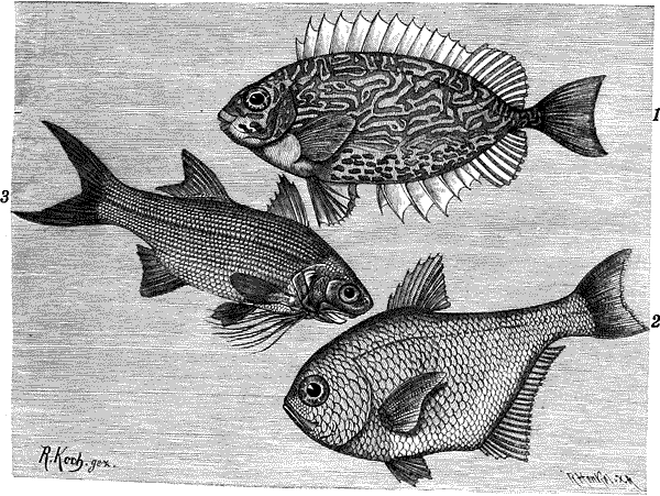 1 — Сиган, или пестряк (Siganus sp.) 2 — Тебарере (Pempheris mangula) 3 — Обыкновенный пальцепёр (Polynemus plebeius)