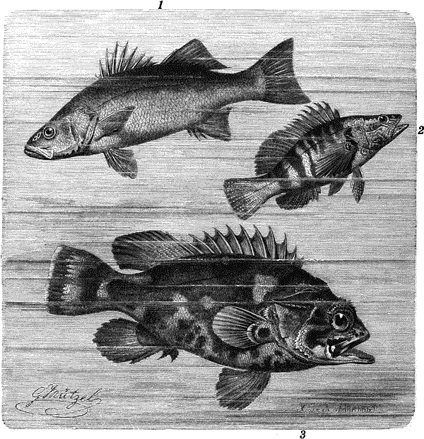 1 — Лаврак (Dicentrarchus labrax) 2 — Каменный окунь (Serranus scriba) 3 — Обыкновенный полиприон (Polyprion americanus)