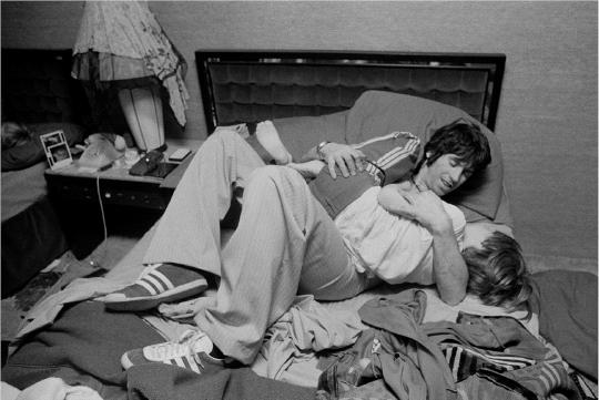 МАРЛОН: Тур 1976-го года проходил по Европе, и потому-то я с ними и уехал на все лето, вплоть до августовского концерта в Небуорте, когда они играли с Lynyrd Skynyrd и 10СС. Меня просили будить Кита, потому что он правда мог начать беситься — не любил, когда его будят. Так что Мик или кто-нибудь подходил ко мне и говорил: нам надо выдвигаться через пару часов, давай-ка сходи разбуди папу. Я единственный мог это сделать без риска, что мне оторвут башку. И я начинал: папа, вставай, тебе надо ехать, собираться, надо успеть на самолет — и он меня слушался. Со мной он был очень мирный. Мы ездили на концерт, а потом возвращались. Я в самом деле не помню никаких особенных вакханалий, правда. У нас был один номер с двумя кроватями. Я будил его и заказывал завтрак прямо к нам. Себе — мороженое или там кусок торта. И официантки часто начинали меня жалеть по-всякому — ах ты мой бедный мальчик, — но я их посылал в жопу. Дико меня доставали. Потом еще я быстро сообразил насчет прихлебателей и всех, кто хотел пробиться к Киту через меня. И так же быстро привык от них избавляться — говорил: слушайте, вы мне здесь не нужны, так что уходите. А Кит мог сказать: эх, мне пора Марлона укладывать, — тоже чтоб очистить территорию. А некоторым девицам или скользким типам я просто говорил: валите отсюда, отец спит, отстаньте от нас, на хуй. С ребенком-то не попререкаешься, поэтому приходилось слушаться.
