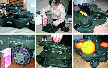 Сверху орудийной башни расположен люк. Чтобы зарядить пушку, надо открыть люк и засыпать шестимиллиметровые пластмассовые шарики (коробка таких шариков входит в комплект). При снятой пушке за аккумуляторным отсеком обнаружились две контактные площадки, к которым подключается орудие, - их можно использовать для подключения чего-нибудь еще.