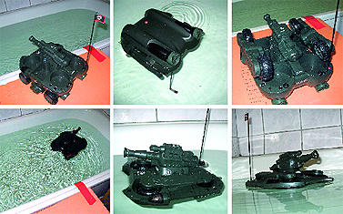 Катерина погнала вездеход на кухню для проведения первого теста. На одном из сайтов я прочитал, что машинка может увезти сразу четыре пивные банки (в сумме 2 кг). Мне в это верилось слабо, так как в свое время я пробовал погрузить на модель "Тигра" 300–400 г оборудования ("КТ" #650), и уже c такой нагрузкой он начинал кое-где буксовать. Пива дома не оказалось, и вместо него Катя нагрузила амфибию двумя мандаринами и двумя апельсинами. C нагрузкой машинка забегала по кухне ничуть не менее резво, чем без нее (видеоролик см. на сайте inside.computerra.ru). После теста мы взвесили транспортируемые фрукты - вышло 700 г, и, судя по поведению вездехода, этот вес для него не предел. Пока дочь развозила по квартире цитрусовые, я включил воду, чтобы наполнить ванну для следующего эксперимента. Больше всего мне хотелось как раз искупать девайс.